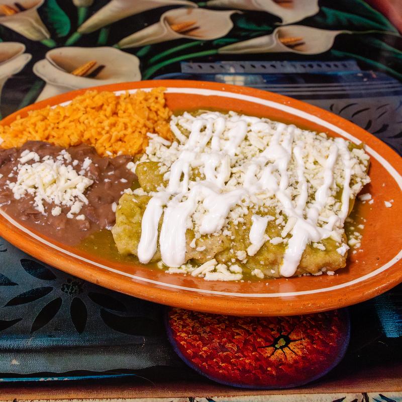 Tortilla filled with chicken in green sauce with cream cheese and onion on top