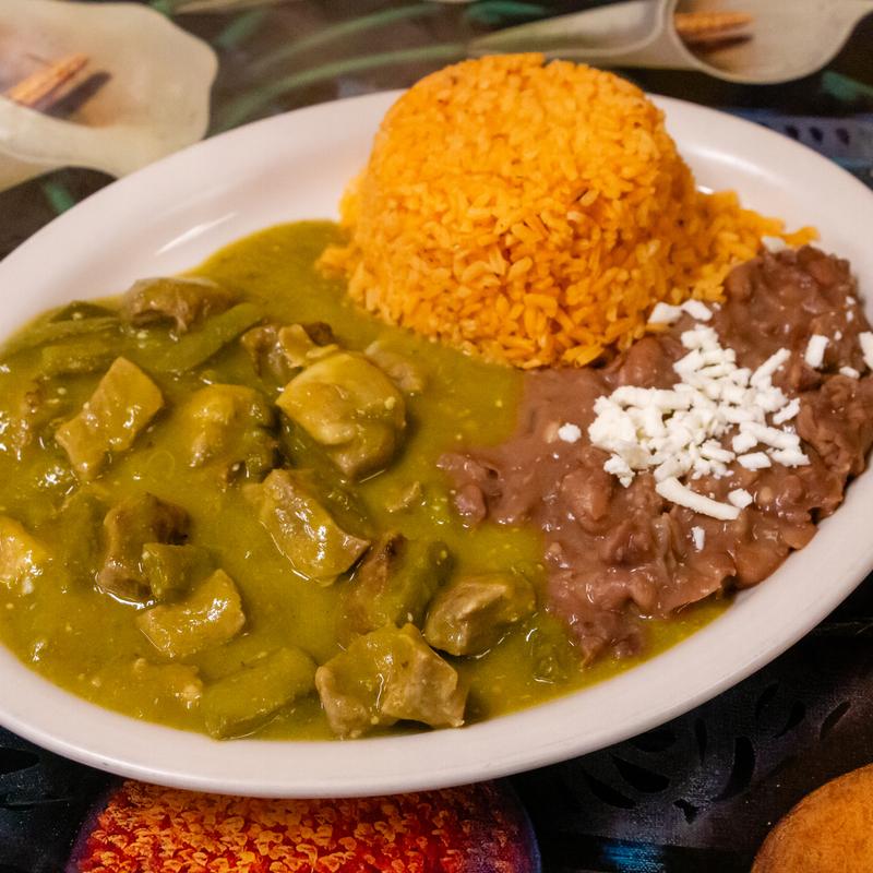 Stew of the day served with rice, beans, soup or broth, water or soda