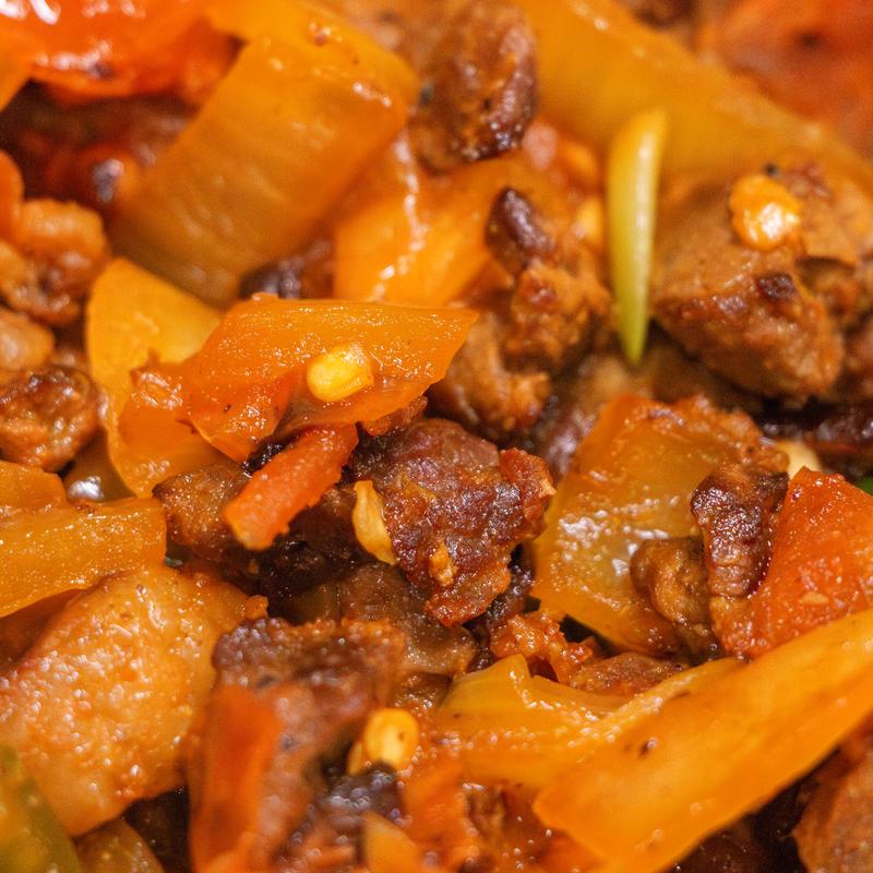 Steak with chopped tomato, chili and onion